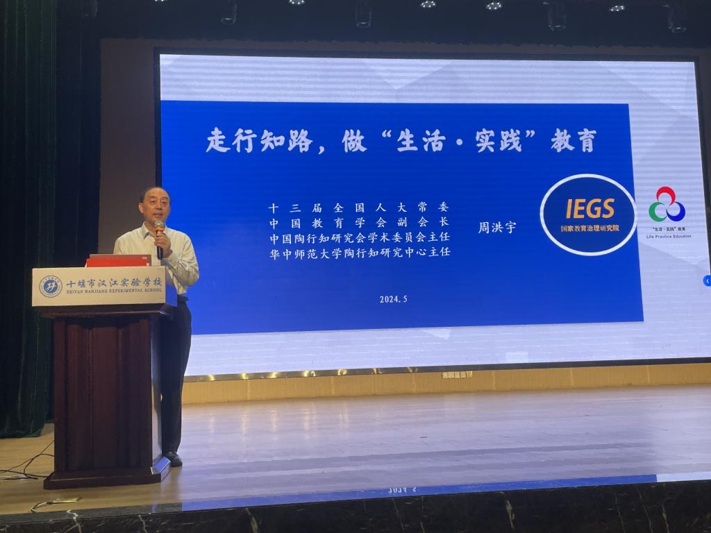 5月10日上午,“生活·实践”教育十堰中心授牌仪式暨教育教学成果交流大会在汉江实验学校召开。中国教育学会副会长、华中师范大学国家教育治理研究院院长、中国陶行知研究会生活·实践教育专业委员会理事长周洪宇教授,华中师范大学国家教育治理研究院秘书长、中国陶行知研究会生活·实践教育专业委员会秘书长刘来兵教授为“生活·实践”教育十堰中心揭牌,为实验区、实验校授牌。十堰市人民政府副秘书长吕钢、十堰市教育局党组成员傅良华、十堰日报社副总编辑陈立波出席会议。我校作为“生活·实践”教育工作站成员单位,校党委常委、副校长吴冰受邀出席并发言,教育学院副院长李光及学院师生代表参加大会。
