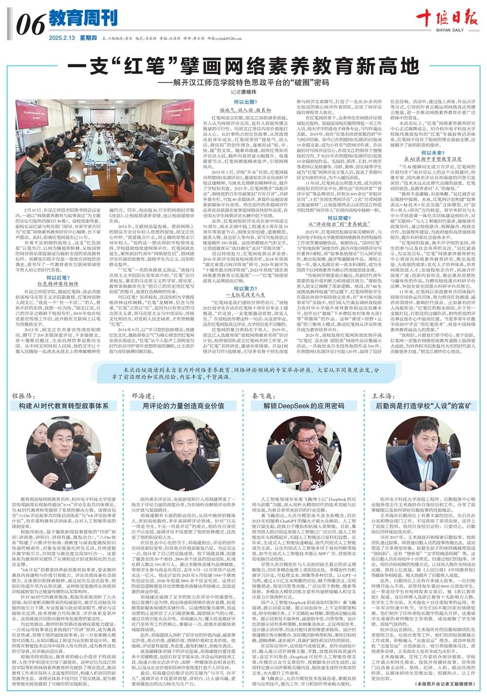 2月13日上午,《十堰日报》06版教育周刊专版报道我校网络素养教育开展和红笔网建设发展情况,原文如下: